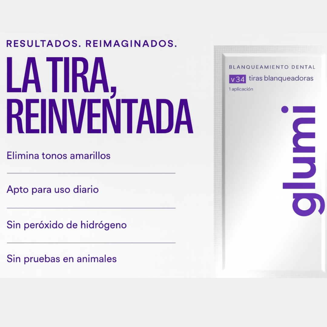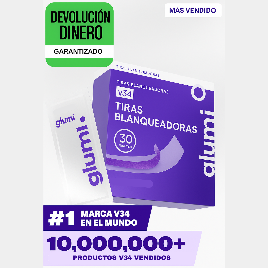 Comienza secando bien tus dientes. Aplica la tira larga de V34 en los dientes superiores, presionando firmemente para que quede bien ajustada. Repite el proceso con la tira corta en los dientes inferiores. Deja actuar las tiras durante 30 minutos para que la fórmula de doble acción haga efecto. Retíralas y cepilla cualquier residuo morado que quede, enjuagando si es necesario.
